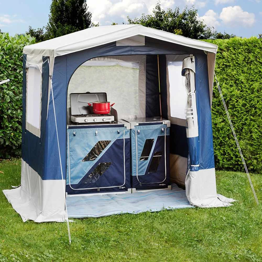 Mit seiner großzu¨gigen Grundfläche leistet es als Kochzelt beste Dienste und bietet zudem als stabiles Gerätezelt viel Platz und Schutz fu¨r all jene Ausru¨stungsgegenstände, die nicht im Freien stehen du¨rfen. Das gesamte Zelt ist aus beidseitig beschichtetem, abwaschbarem Material gefertigt und wird durch ein stabiles Stahlgeru¨st getragen. Drei große, mit Prägefolie verschließbare Gazefenster und eine effiziente Hochentlu¨ftung sorgen fu¨r eine hervorragende Belu¨ftung des Innenraumes. Die breite Eingangstu¨r ist seitlich wegrollbar. Mit umlaufendem Erdstreifen. Inkl. Montagematerial und Packtasche.