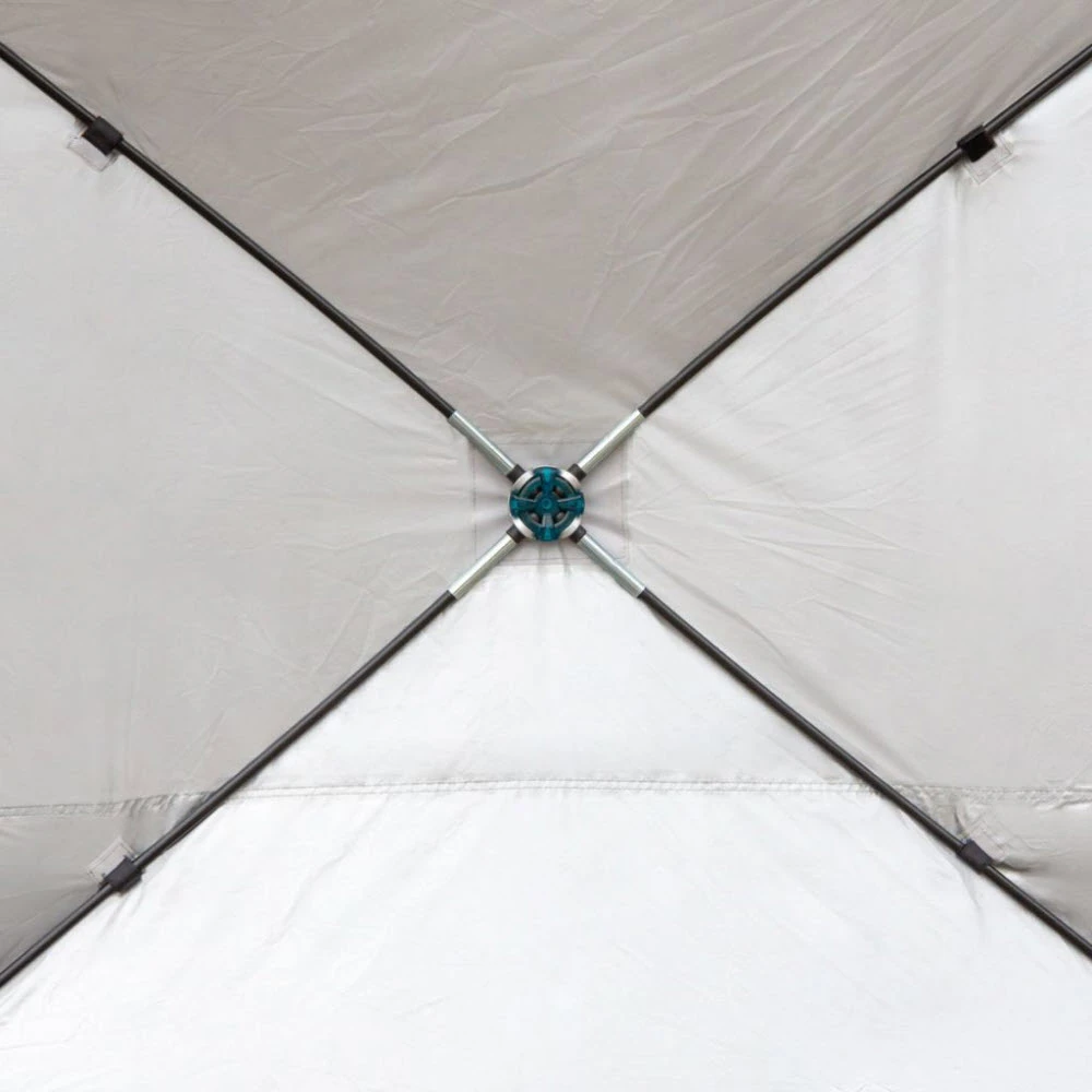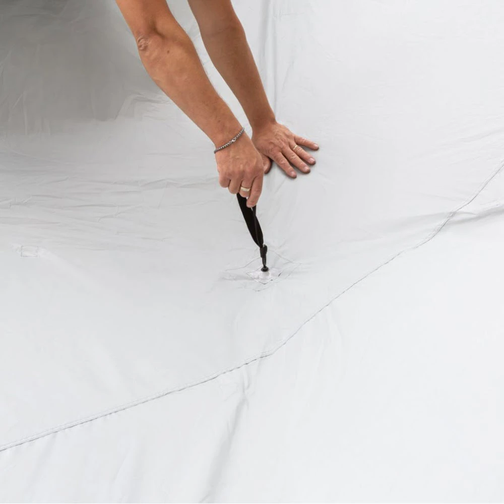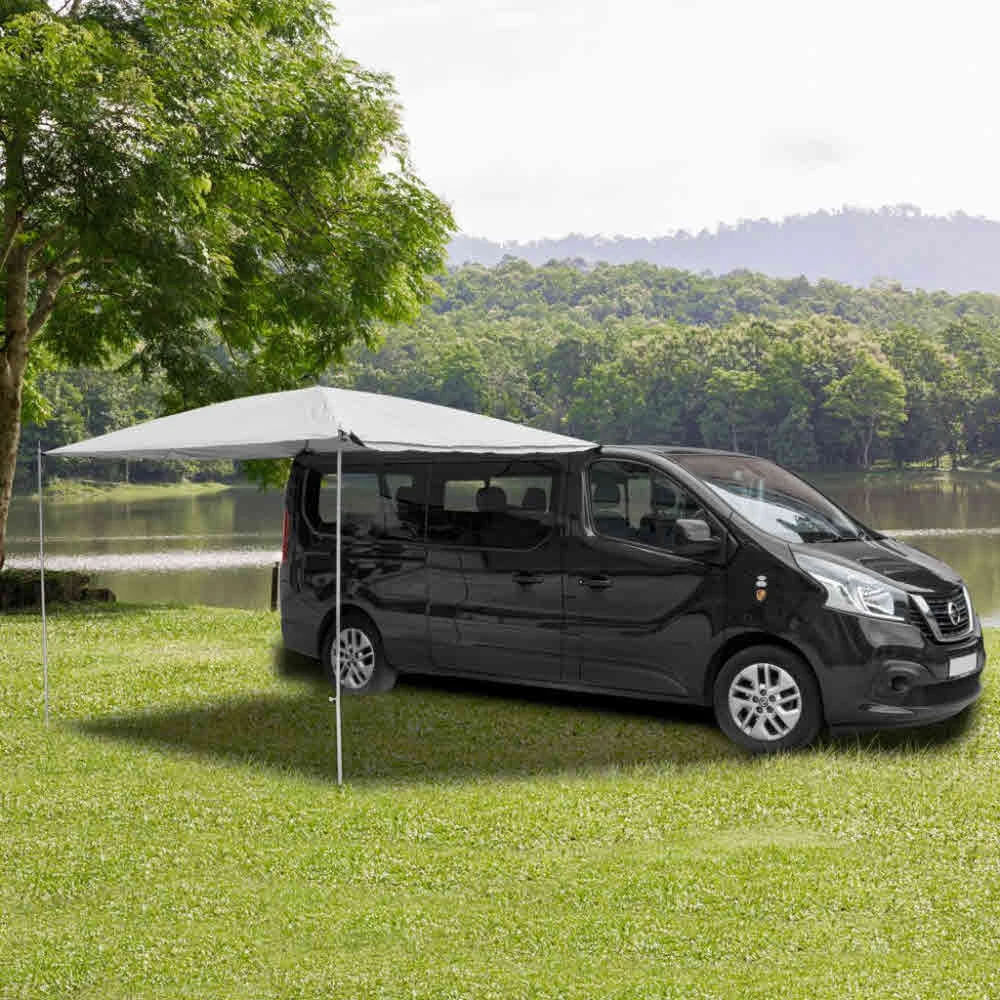 Schnell aufbaubares Sonnendach für Minibusse und Vans mit Fiberglasgerüst, zentraler Stabilisierungsplatte und angenähtem Verbindungskeder. Sehr stabile Konstruktion mit leichter Durchwölbung für optimalen Wasserabfluss. Inkl. 2 Aufstellstangen.