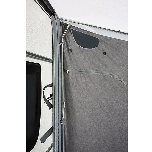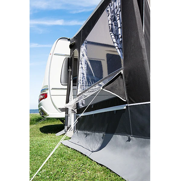 Seitenwände: in jeder Seitenwand eine seitlich wegrollbare Tür; Moskitogaze-Einsätze unterhalb der Fenster mit ausstellbarer und verschließbarer Folienklappe sorgen für eine gute Querventilation im Zelt; die Seitenfenster sind mit Gardinen ausgestattet; Schaumstoffwulste werden mit Klettband befestigt und mit Andruckstangen zur besseren Abdichtung an den Wohnwagen gedrückt. Zusätzliche Hochentlüftungen sorgen für den nötigen Luftaustausch im Zelt; Sturmabspannmöglichkeit unter den Fenstern.