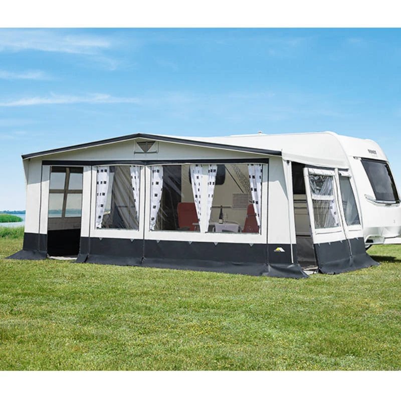 Vorderwand: 3-telig; alle Segmente lassen sich herausnehmen und gegeneinander tauschen; somit Eingangstür an jede Position der Vorderwand versetzbar; Eingangstür hochrollbar; Fenster mit Fensterklappen und Reißverschluss, zusätzlich mit waagerechtem Reißverschluss unterhalb der Fensterklappen verschließbar; Verandaeffekt; waagerechte und senkrechte Hohlsäume mit Klettverschluss; Taschen für Verandastangen mit Klettverschlüssen. Optionale Rundbogentür in der Vorderwand gegen Aufpreis erhältlich (bitte anfragen!).