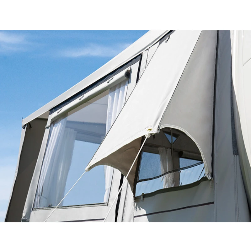 Seitenwände: beide Seitenwände sind gegeneinander austauschbar und zur Veranda abklappbar; eine Seitenwand verfügt über die Kombination Eingangstür und Gaze-/Folienfenster, die andere aus 2 Gaze-/Folienfenstern. Alle Fenster mit Gardinen ausgestattet, zusätzlich doppelte Fensterklappen. Zusätzlich in jeder Seitenwand ein Lüftungsfenster (Moskitogaze). Die Lüftungsfenster in beiden Seitenwänden mit hochroll- und abspannbarer Wetterschutzhaube, so dass dauerhaft und wetterunabhängig eine geschützte Querventilation hergestellt werden kann. Alle Klappen und Wetterschutzhauben ringsum mit Reißverschluss verschließbar, auch waagerecht. Senkrechter und waagerechter Hohlsaum für Sturmgestänge mit Klettverschluss; optionaler Erkeranbau an der rechten Seite möglich (bitte anfragen!).