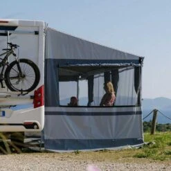 Material: Dach und Seitenwände, Spritz- und Erdstreifen aus beidseitig kunststoffbeschichtetem und lackiertem Polyestergewebe, Vorderwand aus atmungsaktivem (wasserdampfdurchlässigem) Trailtex-Gewebe. Dach und Wände einfach abwaschbar und sehr witterungsbeständig. Fensterfolien absorbieren mindestens 90% der UV-Strahlung.