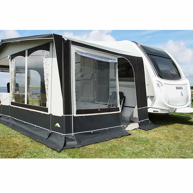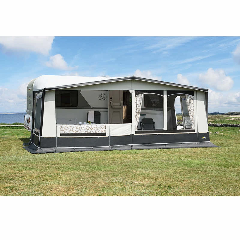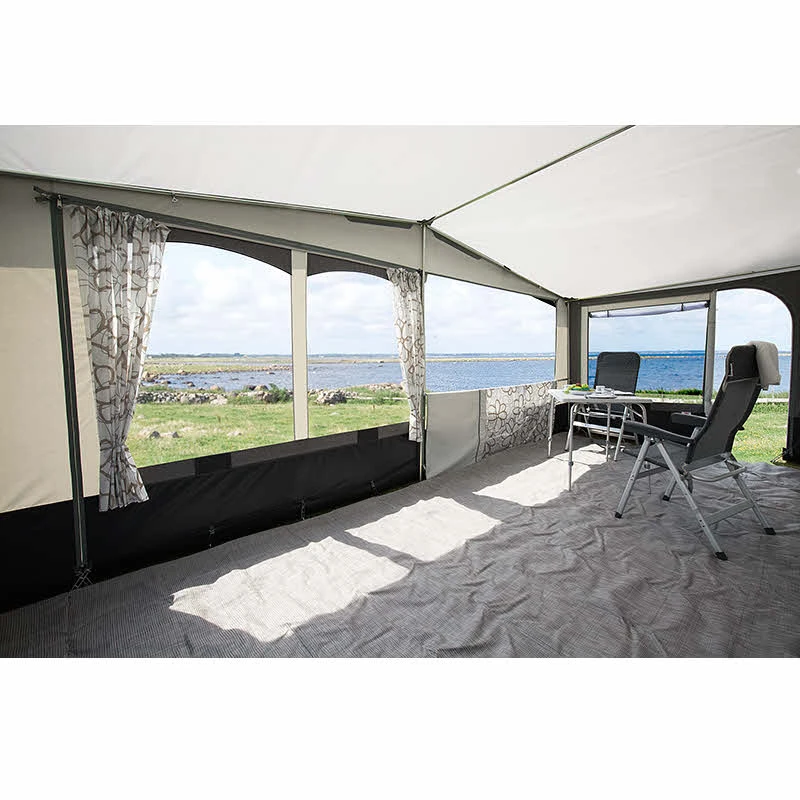 Vorderwand: teilbar und herausnehmbar; hochrollbare Tür links der Mitte; Fenster mit Gardinen ausgestattet; waagerechte Hohlsäume unter den Fenstern zur Aufnahme von Sturmgestänge oder Verandastangen. Ab Größe 16 linkes Vorderwandfenster in 2 Fenster unterteilt.