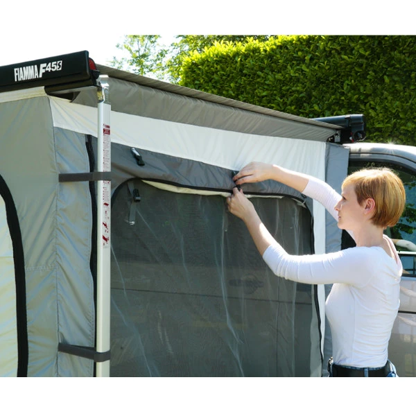 Die aufrollbaren Seitenwände mit Fenstern sind mit einer Verdunkelung ausgestattet; abnehmbare Frontwand mit Klarsicht-Fensterfolie und Tür.