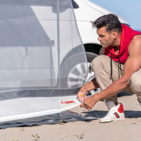 Praktische Vorderwand aus Maschengewebe. Zum Einziehen in die Kederschiene. Aufrollbar mit praktischen Clips zur Befestigung. Inklusive Spannbändern und Erdnägeln.