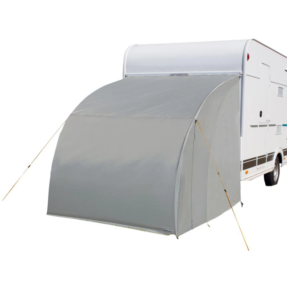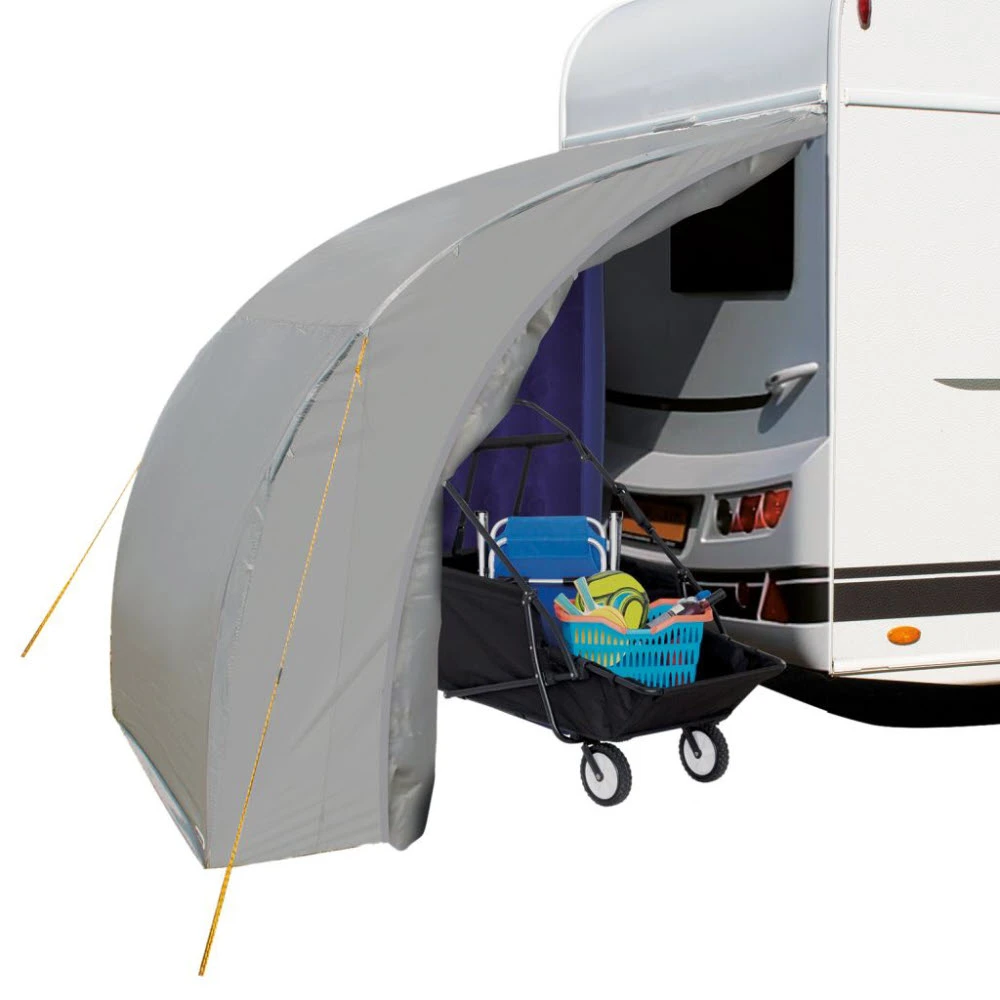 Lagerzelt zur Befestigung an der Hinterseite des Wohnwagens. Das Zelt ist mit einem Keder, 2 Fiberglasstangen und Abspannpunkten zur Befestigung ausgestattet. Somit erhalten Sie einen extra geräumigen Stauraum für Fahrräder, Campingmöbel oder weitere Ausrüstung. Der ideale Platz, um Ihre Sachen vor Regen und Schmutz zu schützen. Einfach und schnell aufzubauen. Nicht für den Dauereinsatz geeignet.