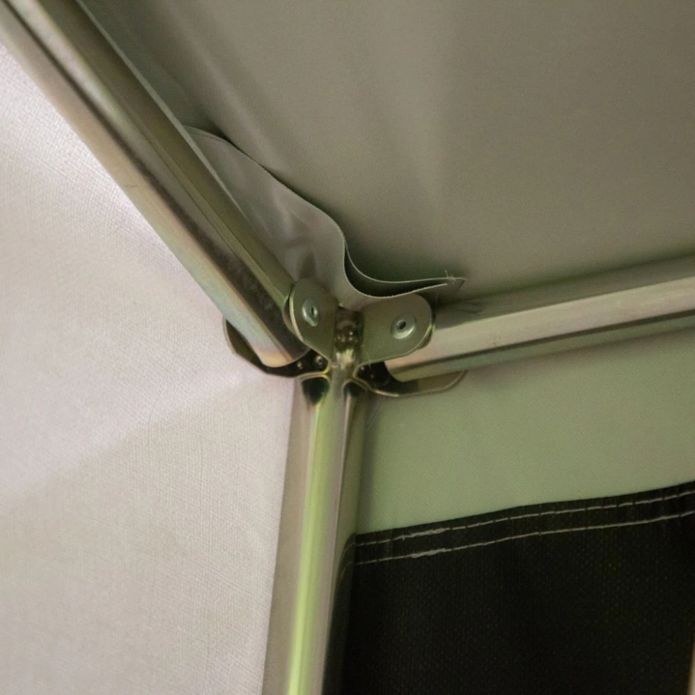 Vorderwand und Seitenwände haben außenliegende Erdstreifen mit Ösen an den wichtigen Punkten. Seiten-Eingang mit hohem Bogen-Reißverschluss. Vorderwand mit großem Fenster und Gardine. Abspanndreiecke in der Vorderwand eingearbeitet.