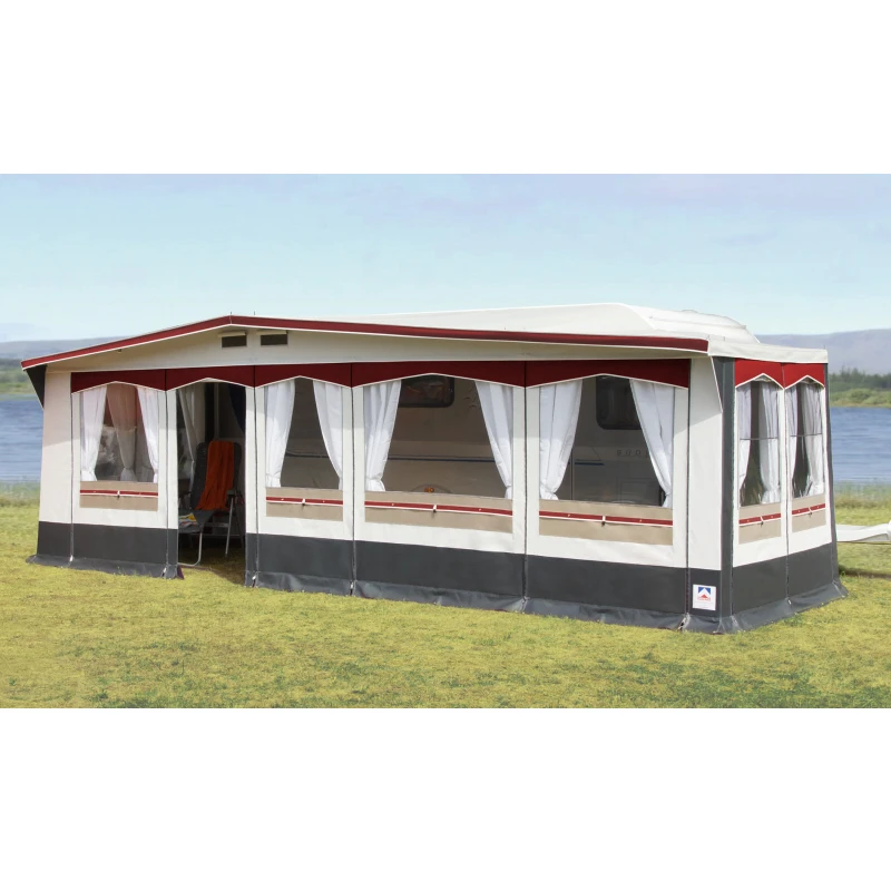 Lieferumfang: Vorzelt, Gestänge, Schürze und Radkastenabdeckung aus Planenstoff, Gardinen, Abspannmaterial, Packsäcke, Deichselhaube und Trennwand.