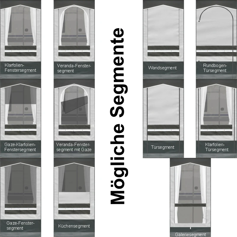 - alle Gaze-/Folien-Segmente haben doppelte Fensterklappen (Klarfolie und Planenstoff)