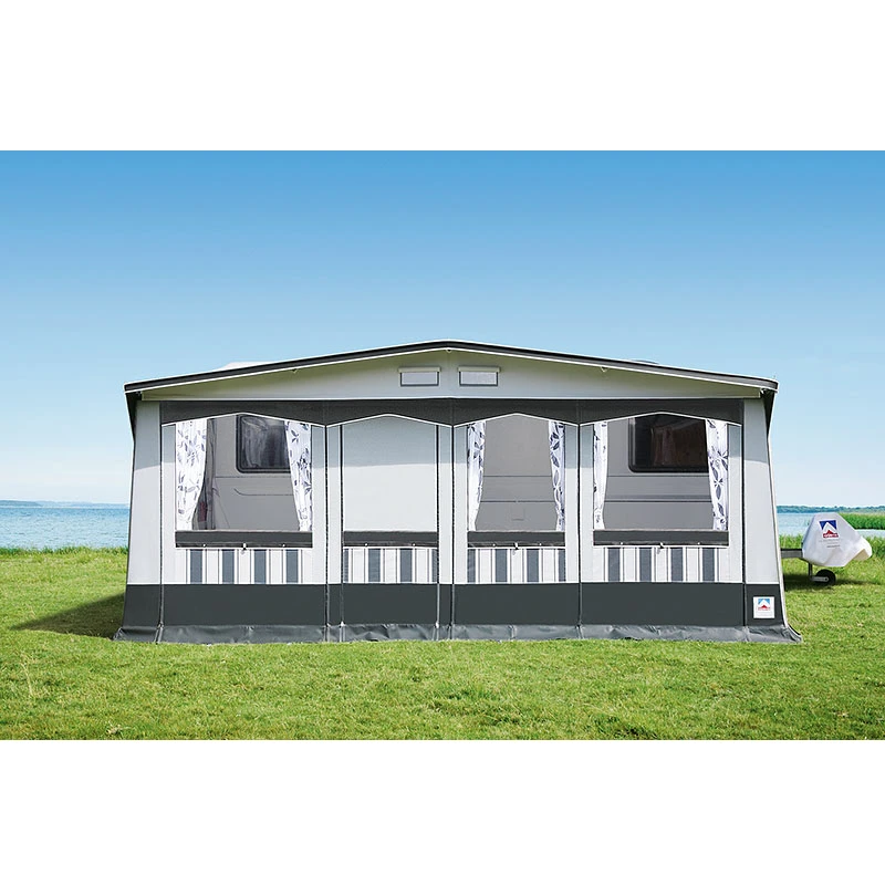 Lieferumfang: Vorzelt, Gestänge, Schürze und Radkastenabdeckung aus Planenstoff, Gardinen, Abspannmaterial Packsäcke und Deichselhaube.