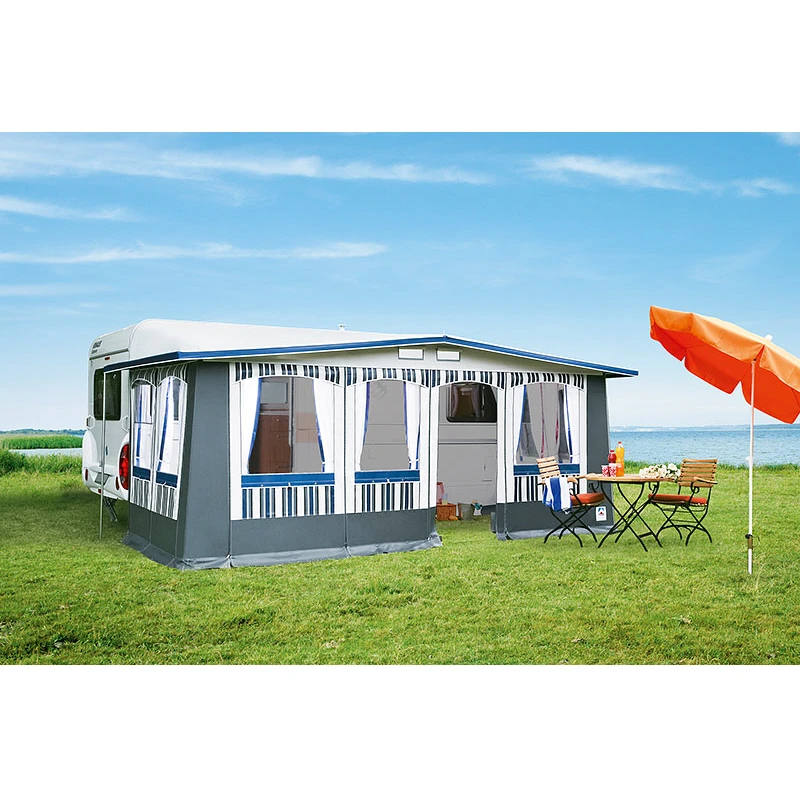 Lieferumfang: Vorzelt, Gestänge, Schürze und Radkastenabdeckung aus Planenstoff, Gardinen, Abspannmaterial Packsäcke und Deichselhaube.