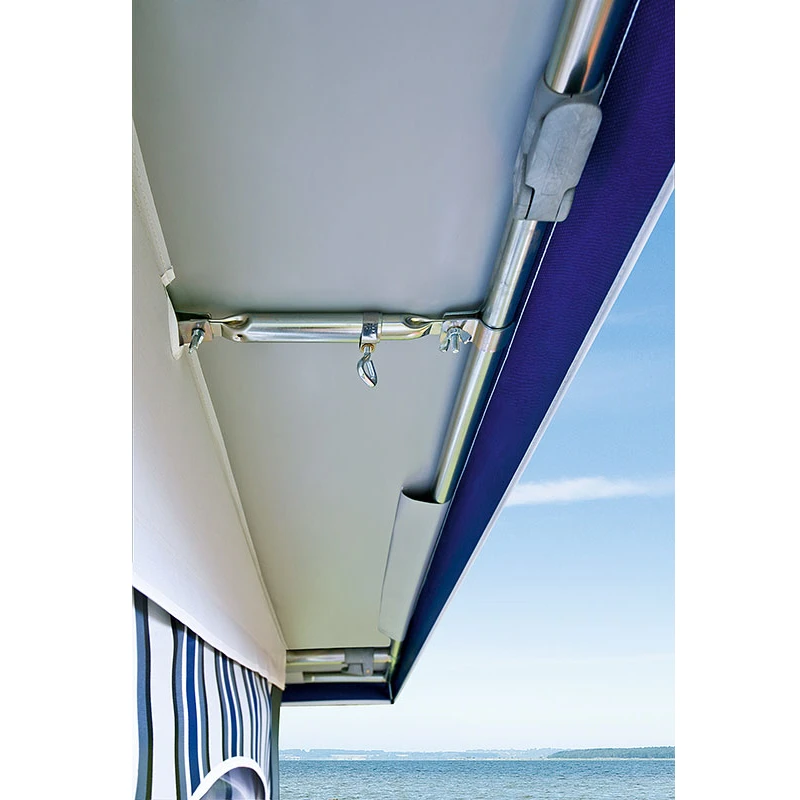 Klassisch und einem Bungalow ähnelnd präsentiert sich unsere Dachform TOP. Ein ringsum überstehendes Dach mit einer Tiefe von 30 cm schützt die Wände vor Wetter. Dachüberstände sind Windangriffsflächen. Diese Dachform ist daher insbesondere für eine Standortwahl im Landesinneren und an geschützten Plätzen geeignet. Das ringsum überstehende und mit Gestänge verstärkte Dach verleiht Ihrem Zelt einen robusten und standhaften Anblick. Beachten Sie beim Wintercamping, dass zusätzliche Schneelasten im Bereich des Dachüberstandes die Stabilität beeinträchtigen können.