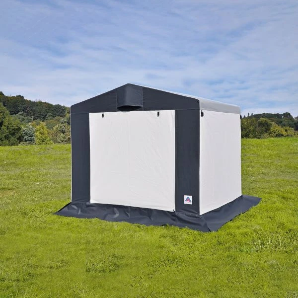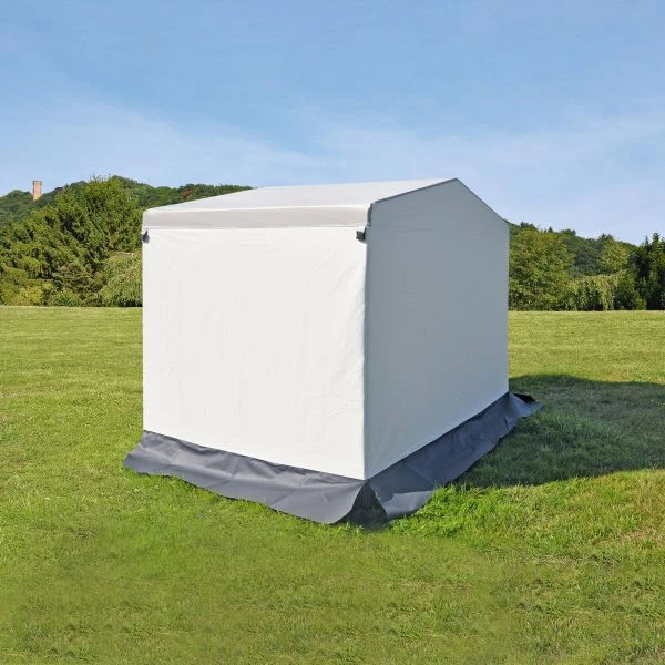 Das Gerätezelt Weser ist ein hochwertiges Gerätezelt für den Dauereinsatz. Die Vorderwand ist mit zwei Senkrecht-Reißverschlüssen und Hochentlüftung versehen. Eine Abspannmöglichkeit innen sowie 4 Sturmgurtclips an der Außenseite bieten den nötigen Halt. Optional erhältlich ist ein Sturm-Abspannset.