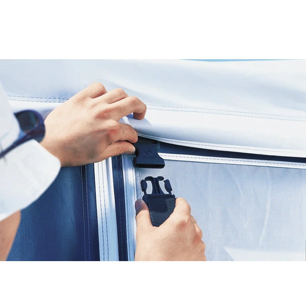 Sicherer Stand bei Wind und Wetter. Sicher ist sicher! Dieses extrem robuste Abspannband sichert Ihr Zelt bei starkem Wind. Das Sturmband wird an den Seiten der Vorderwand eingeclipst, ohne das seitliche Vordachgestänge zu belasten. Durch den Einsatz einer zusätzlichen Feder wird die Zugbelastung auf Gurt und Zelt deutlich gedämpft. Eine lohnende Investition in die Sicherheit Ihres Zeltes.