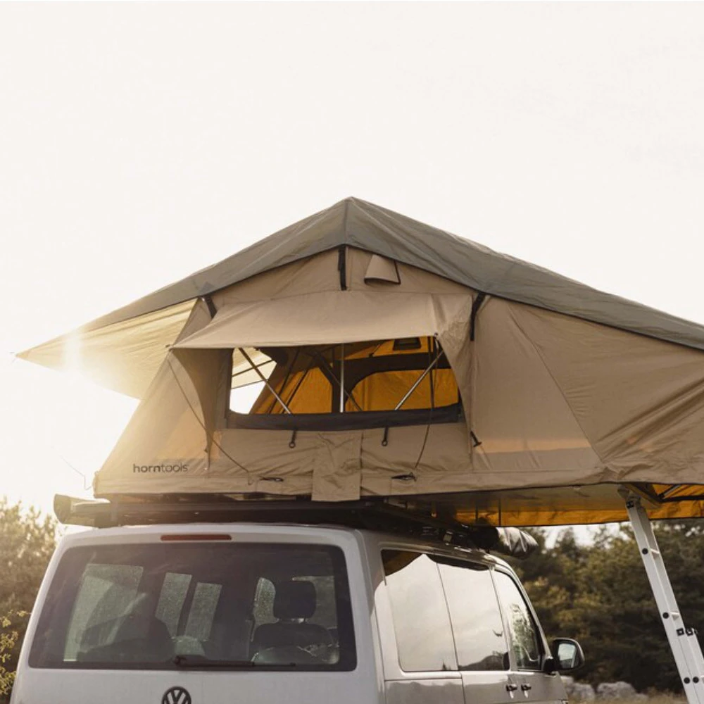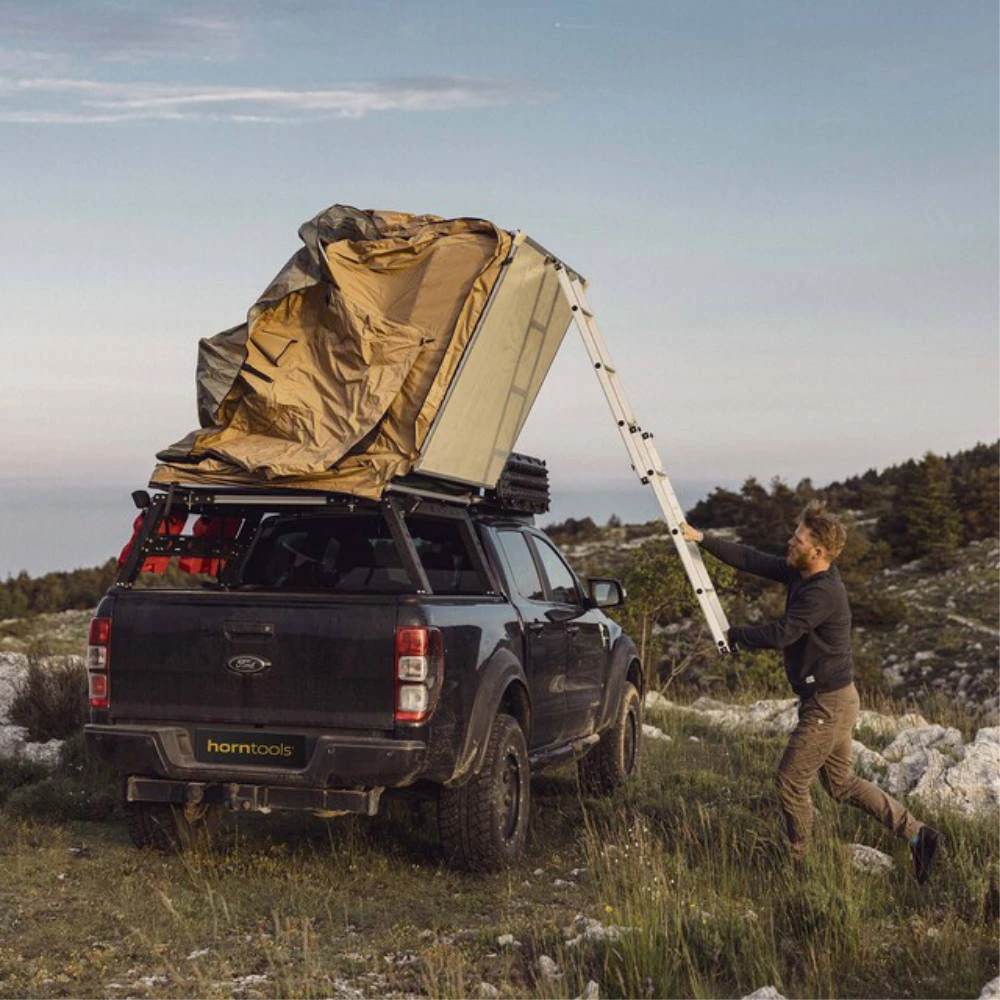 Zusätzlich zum Dachzelt haben wir auch ein großzügiges Vorzelt im Sortiment. Der Boden ist wasserdicht, der wahlweise auch demontiert werden kann. Die Fenster seitlich können geschlossen werden und sind auch durch Moskitonetze geschützt. Das Vorzelt ist mit einem YKK Reißverschluss in 3 Minuten am Dachzelt befestigt. Ab einer Fahrzeughöhe von 2,10 m ist eine Leiterverlängerung und eine Vorzeltverlängerung empfohen.