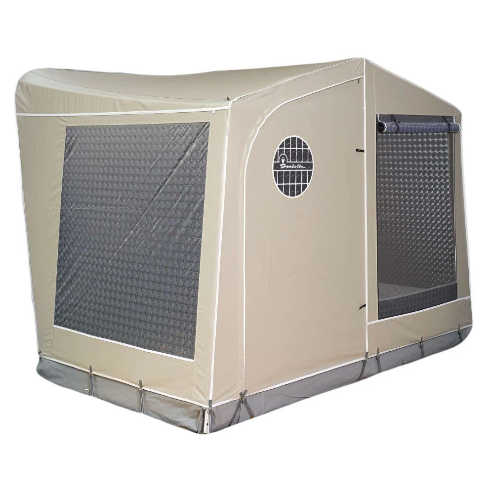 Alle Anbauten werden mittels Reißverschluss mit dem Zelt verbunden und verfügen über Stehhöhe. Ein zusätzlicher Reißverschluss am Anbau ermöglicht, dass die Seitenwand des Vorzeltes z. B. als Trennwand wieder eingesetzt werden kann.