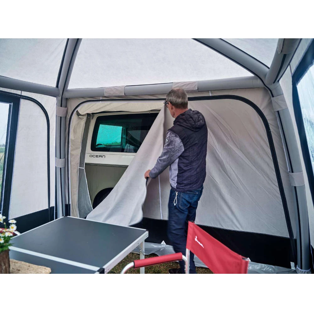 Isabella Air X-Tension bietet Ihnen die ultimative Freiheit im Campingurlaub. Durch das Luftgerüst wird ein schneller und einfacher Auf- und Abbau ermöglicht. Dadurch sind Sie in kürzester Zeit für die Weiterreise bereit. Entscheiden Sie sich für einen Aufenthalt am Campingplatz, kann das X-Tension-Luftvorzelt einfach als Platzhalter stehen bleiben, während Sie mit Ihrem Campingbus die Umgebung erkunden. Einfach die Schleuse vom Campingbus abmontieren (dauert gerade mal 1-2 Minuten) und die Rückseite des Zeltes mittels Reißverschluss verschließen.