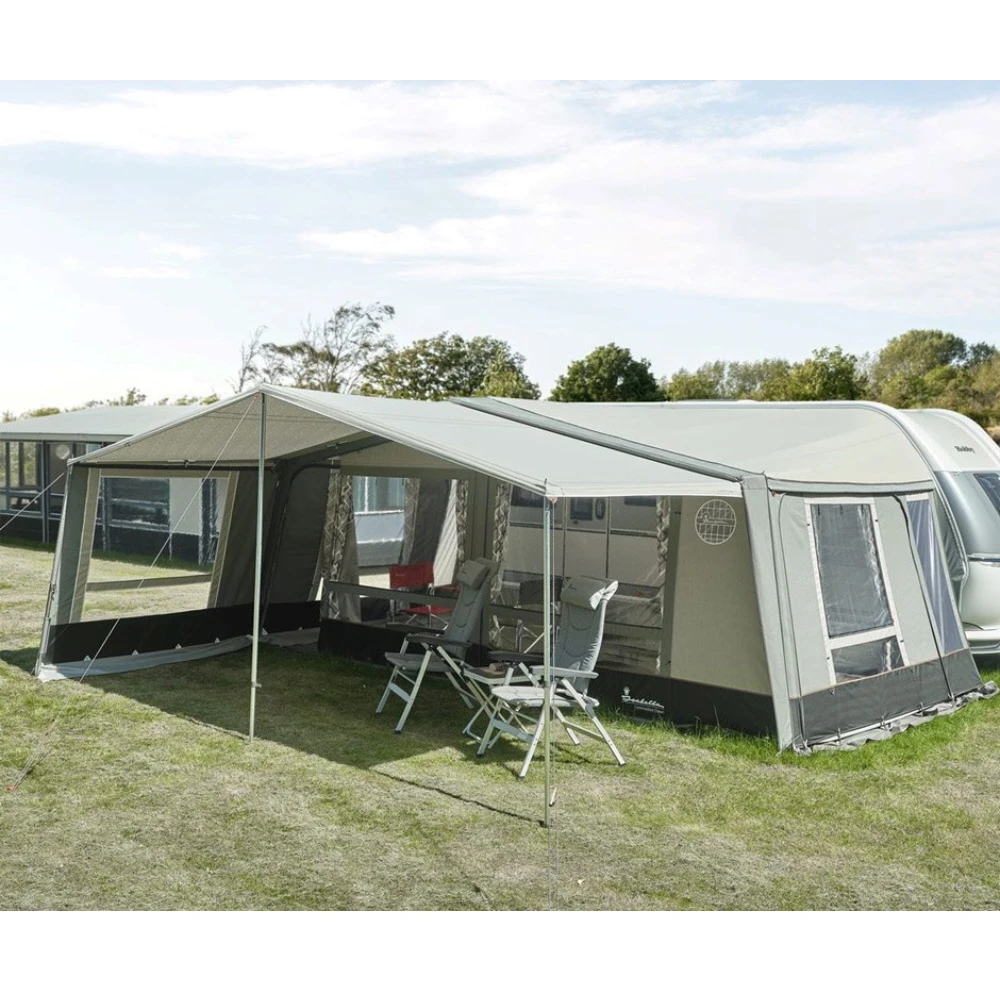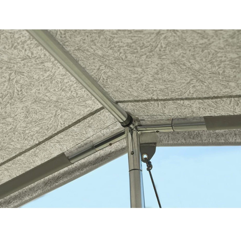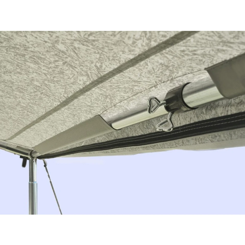 Mit dem Mega-Zinox-Gestänge steht das Atlas-Sonnendach besonders stabil, selbst bei Regen und Wind. Deshalb ist dieses Sonnendach für Saisoncamper besonders geeignet. Das Atlas-Frontsonnendach wird am Dachüberstand Ihres Vorzelts mit Hilfe des 3 Mega – F-Links montiert. Damit wird ein Schattenplatz geschaffen und die überdachte Fläche verdoppelt.