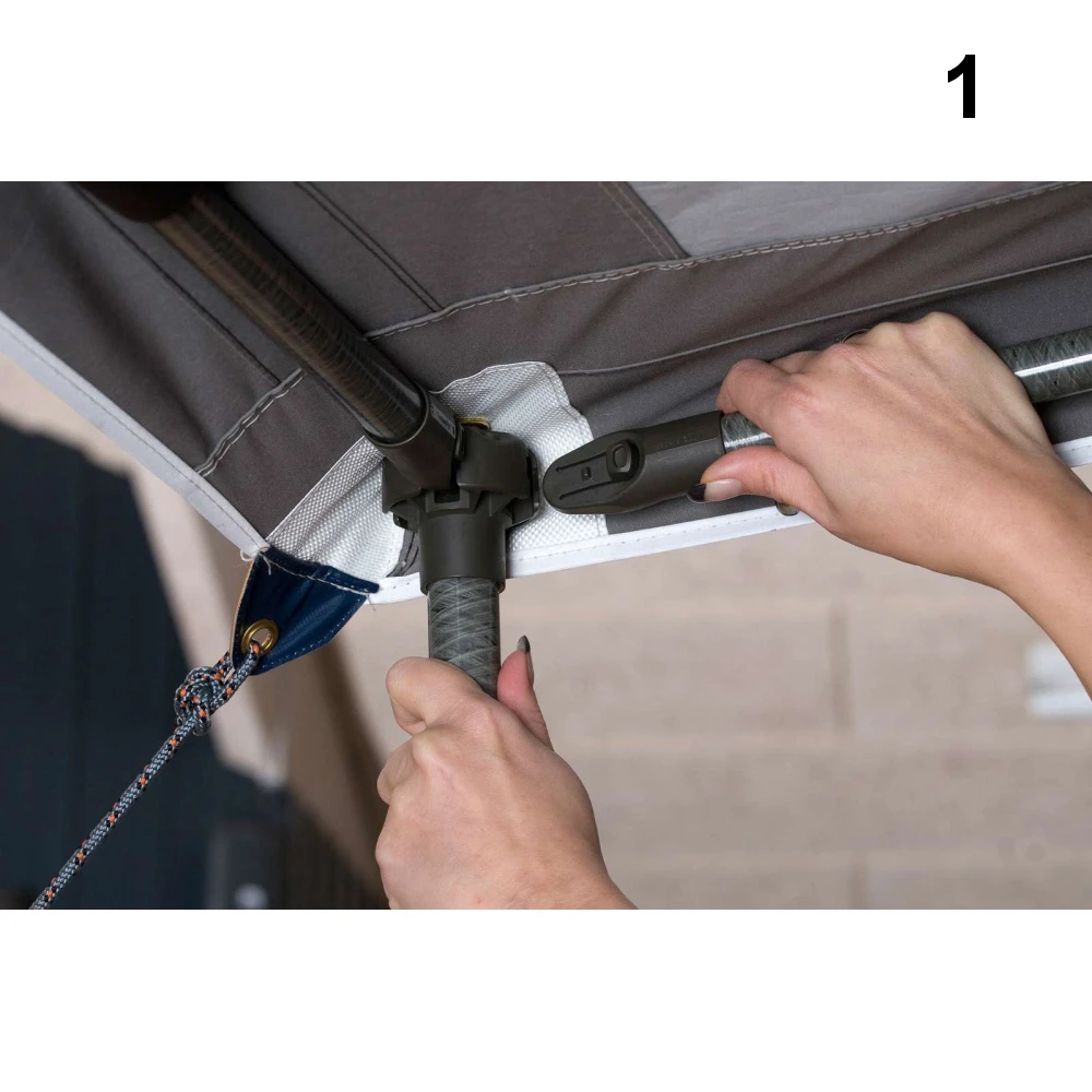 Das Eclipse kann nicht nur als Frontsonnendach für fast alle unsere Vorzeltmodelle verwendet werden, sondern zudem auch als einfaches Reisesonnendach direkt an Ihrem Wohnwagen dienen. Ein Dach, zwei Verwendungsmöglichkeiten. Das CarbonX Gestänge mit IsaFix-Schnellverschlüssen und „Tectum Pro“ Verbindungselementen ermöglicht ein geringes Gewicht, schnellen Aufbau und eine große Flexibilität.