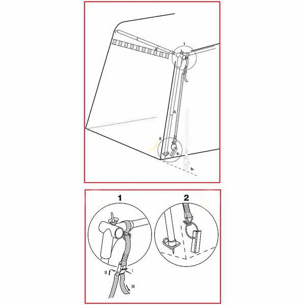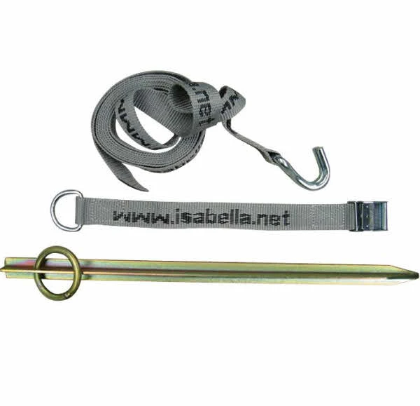 Die Isabella-Sturmsicherung wird von innen am Gestänge montiert und sichert zusätzlich jedes Sonnendach oder Vorzelt bei starkem Wind. Durch die innenliegende Montage ergeben sich keine Scheuerstellen am Dach. Auch Stolperfallen werden vermieden. Es werden 2 Sturmsicherungen pro Zelt (für linke und rechte Vorzeltecke) empfohlen. Bei großen Zelten kann zur Sicherheit noch die mittlere Stützstange mit einer zusätzlichen Isabella Sturmsicherung gesichert werden.