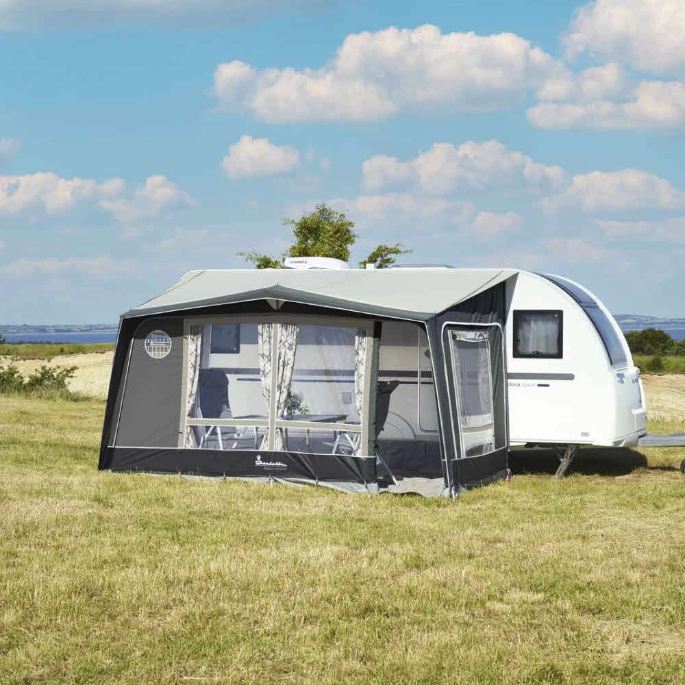 Serienmäßig mit: Gardinensatz Collage Sand, Verandastange, Windblende, Radkastenabdeckung, schraubenfreie FixOn-Beschläge, Zelttasche, Gestänge- und Heringssack und Heringsauszieher.
