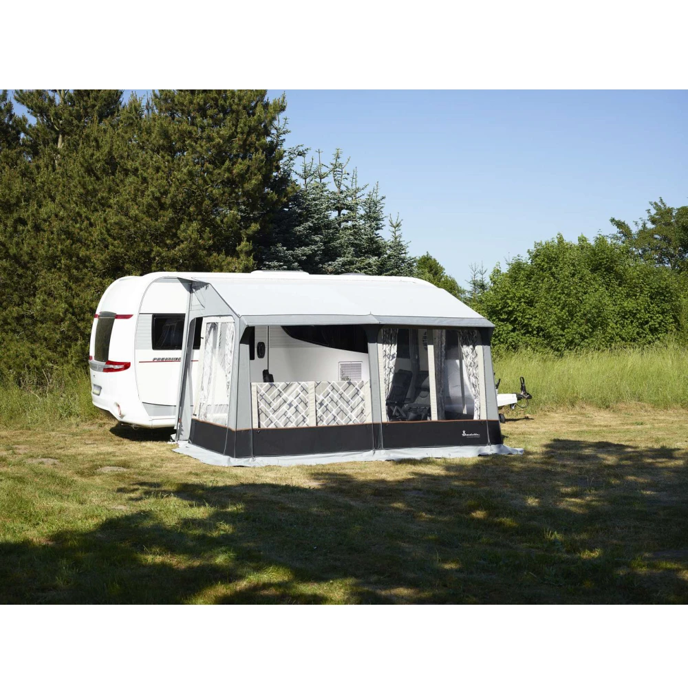 Beim Universal Dawn 360 wurde vor allem auf Stabilität und Funktionalität geachtet. Die spezielle Dachkonstruktion mit Mittelkreuzen und Querstangen, verleihen diesem Modell eine hohe Belastbarkeit. Durch eine zusätzliche Wintersicherung kann diese sogar noch erhöht werden. Die beiden mitgelieferten gebogenen Stützstangen drücken die fest angenähten Schaumstoffkissen an den Wohnwagen und sorgen für einen perfekten Anschluss. Für ein gutes Raumklima sorgt das Isacryl-Gewebe, welches atmungsaktiv und robust zugleich ist.