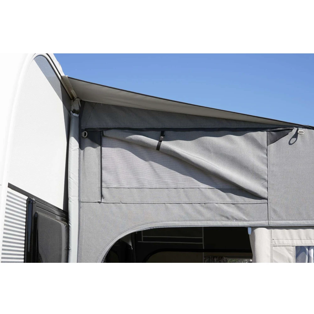 Beim Universal Dawn 420 wurde vor allem auf Stabilität und Funktionalität geachtet. Die spezielle Dachkonstruktion mit Mittelkreuzen und Querstangen, verleihen diesem Modell eine hohe Belastbarkeit. Durch eine zusätzliche Wintersicherung kann diese sogar noch erhöht werden. Die beiden mitgelieferten gebogenen Stützstangen drücken die fest angenähten Schaumstoffkissen an den Wohnwagen und sorgen für einen perfekten Anschluss. Für ein gutes Raumklima sorgt das Isacryl-Gewebe, welches atmungsaktiv und robust zugleich ist.