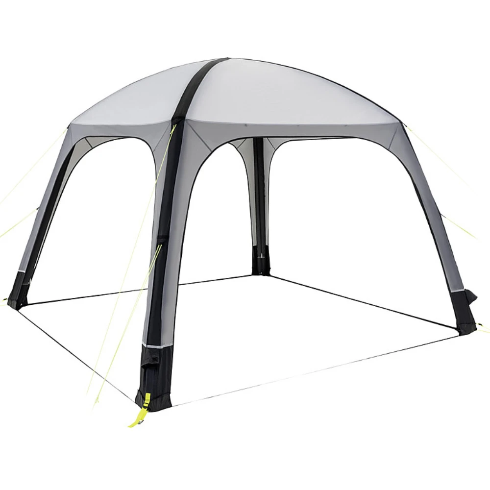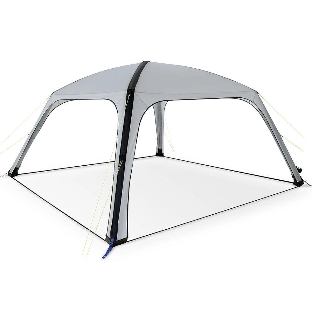 Der Luft-Pavillon lässt sich im Handumdrehen mit Hilfe der mitgelieferten Handpumpe aufstellen. Sie brauchen nur die vier Ecken mit Heringen zu verankern und den Pavillon an den beiden Aufblaspunkten außen aufzublasen. Unter dem Pavillon sorgen Spanngurte für die Beibehaltung der rechteckigen Form. Die im Lieferumfang enthaltenen Spannseile und Heringe bieten zusätzliche Stabilität. Mit dem innovativen Weathershield 68D Material bleiben Gewicht und Packgröße auf ein Mindestmaß beschränkt.