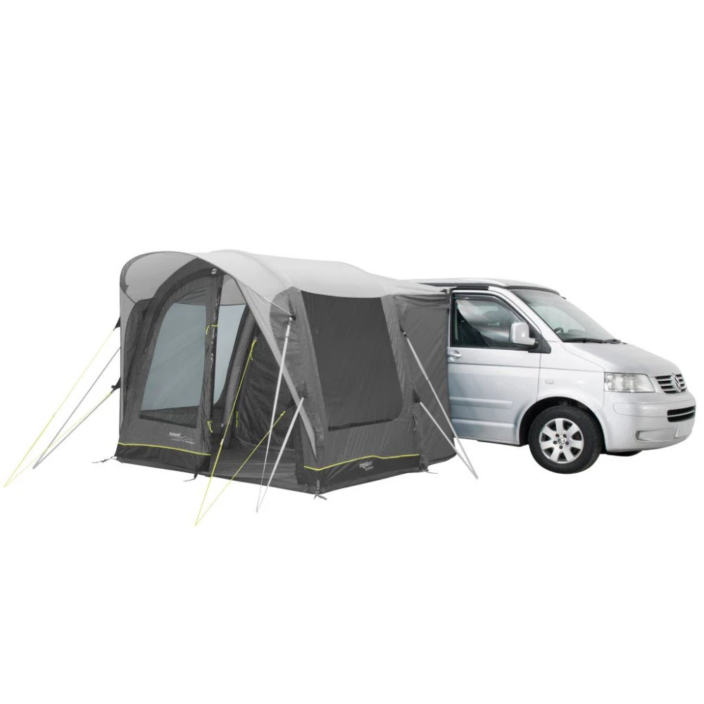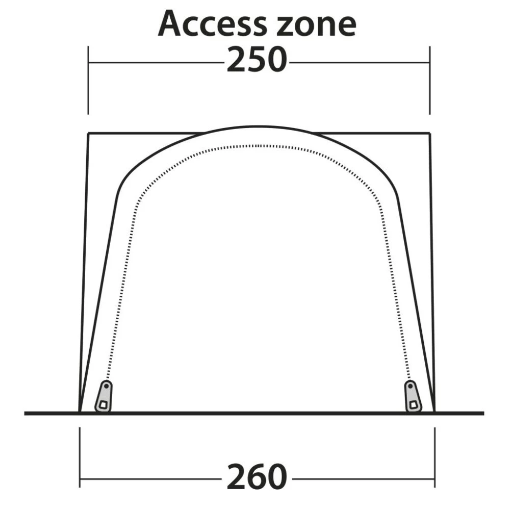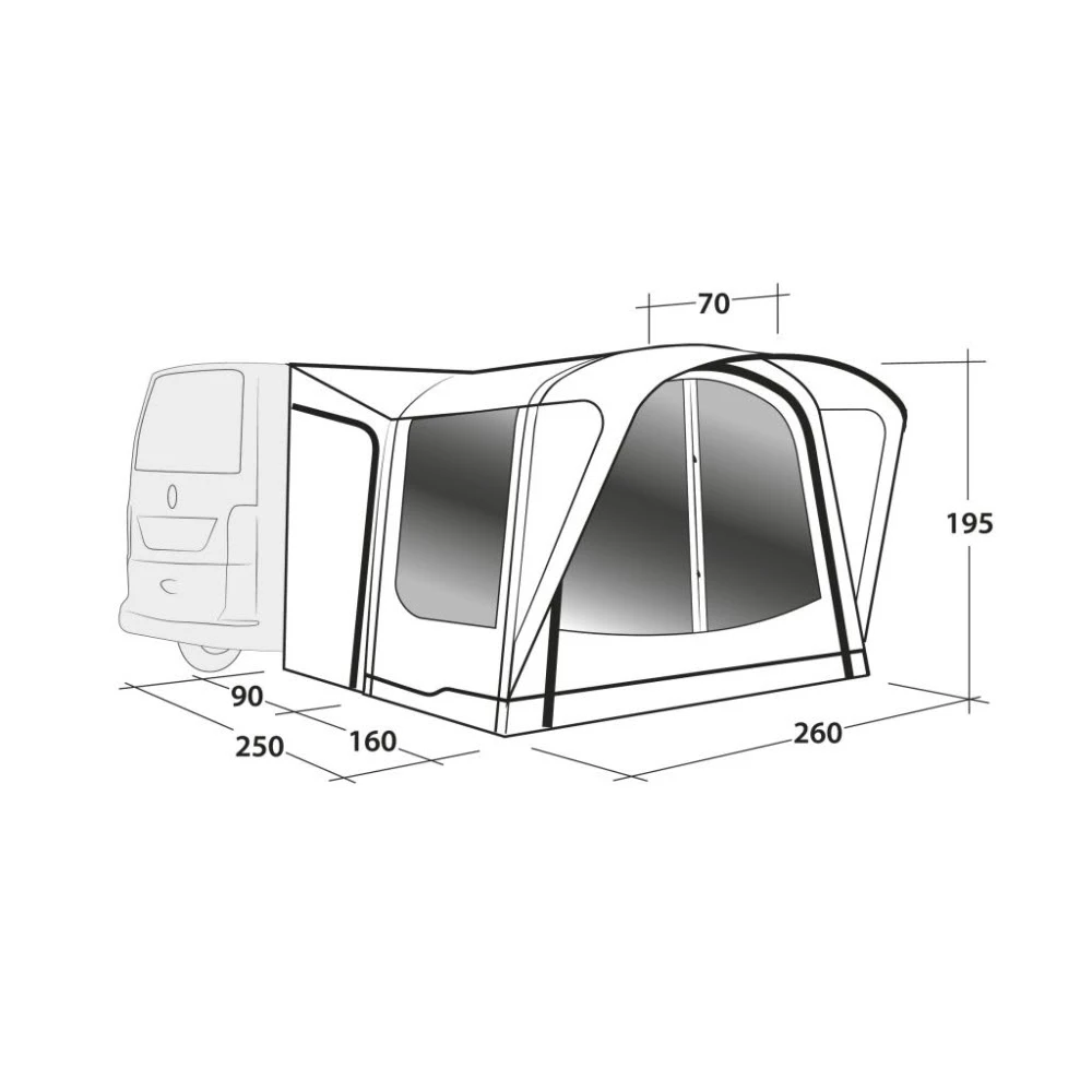 Die Tunnelzeltkonstruktion des freistehenden Vorzelts Newburg 160 Air verfügt in der Link Access Zone über zwei einander gegenüberliegende Eingänge. Eine Gewebebahn bietet die Möglichkeit, die Höhe zu verstellen. Das Vorzelt lässt sich mithilfe eines Doppelkeders (5 und 7 mm) schnell und einfach an Wohnmobile anbauen.