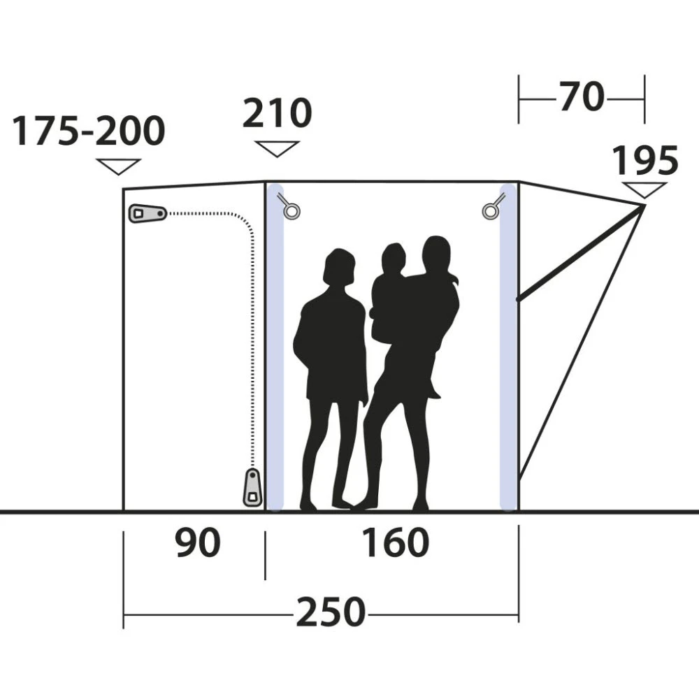 Ein Abspannleinenhaltersystem verhindert, dass sich die Leinen verheddern. Ausgestattet mit Outwell Hochlastreißverschlüssen und Zeltboden für Link Access Zone System mit integrierter Bodenschürze. Das HookTrack System bietet vielseitige Optionen zum Aufhängen von Lampen und anderen Gegenständen mit einem Gewicht bis 1,5 kg.