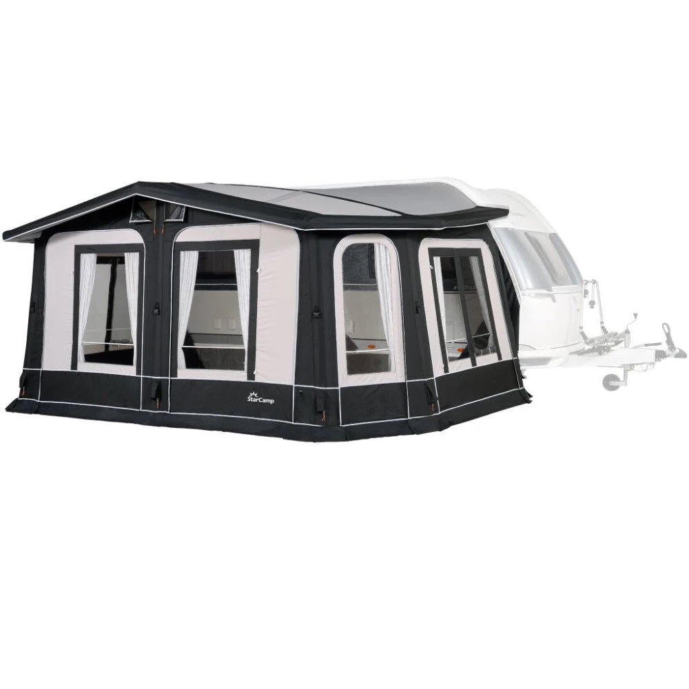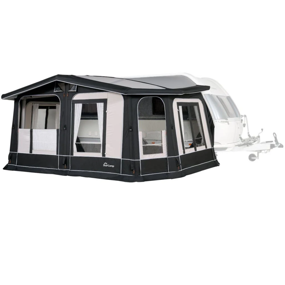 Das erste volleingezogene Luftschlauch-Vorzelt mit einer Tiefe von 280 cm. Speziell entwickelt, um vor Ihrem Wohnwagen einen großen, luxuriösen Wohnraum mit viel Tageslicht zu schaffen. Wetterfest, mit versiegelten Nähten und doppeltem Faulstreifen. Optional kann das Vorzelt an der gewünschten Seitenwand mit einem Anbau erweitert werden.