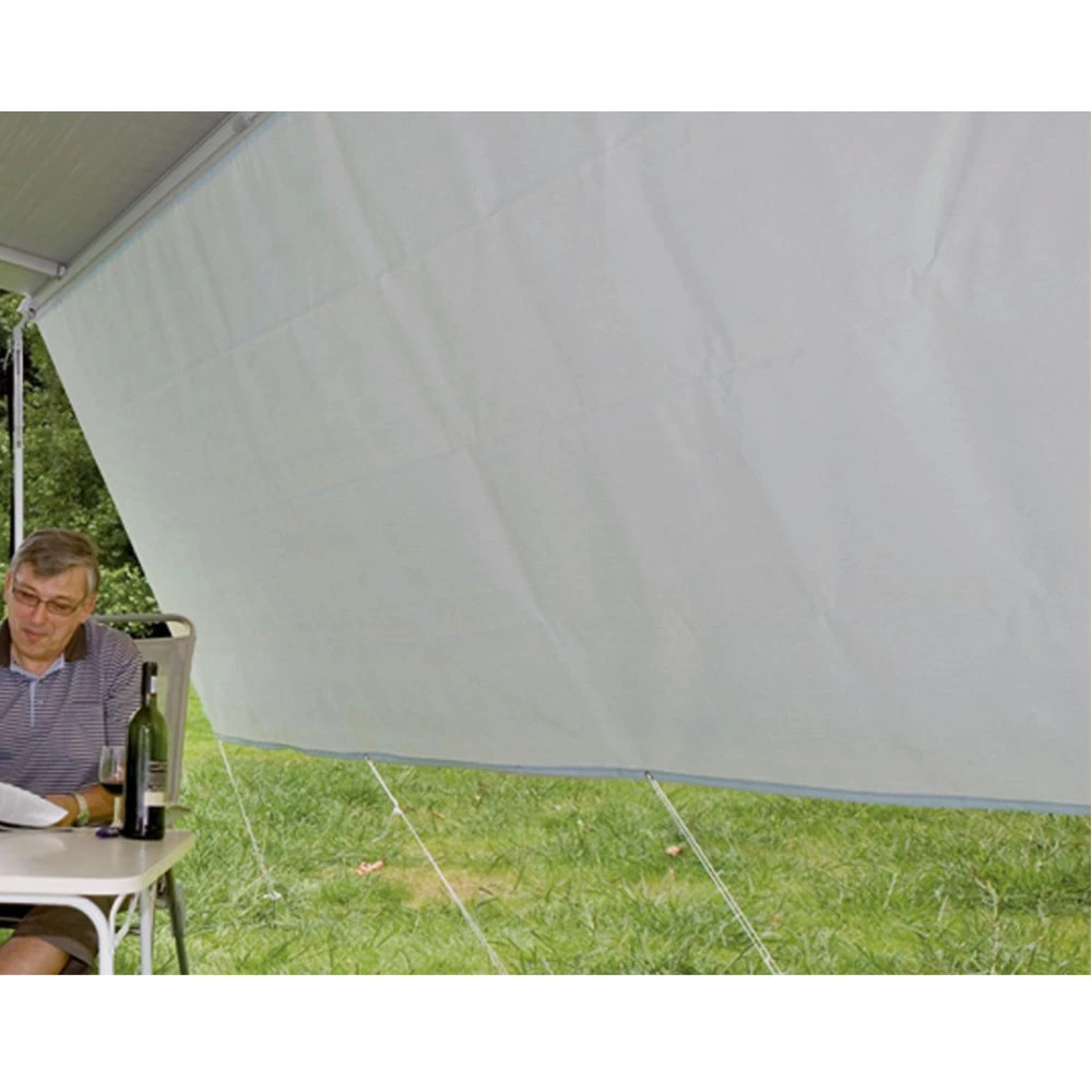 Alle Seitenteile sind universell passend für links und rechts. Sie werden mit Hilfe von Spannstangen mit integrierter Kederleiste montiert, die Vorderteile werden in die Markisenfront eingezogen. Mittels einfacher Schlaufen werden beide an den Stützfüßen befestigt.