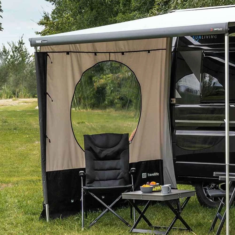 Mit dem Travellife Scala Seitenteil universal ist es möglich immer im Freien zu sitzen, während vor verschiedenen Witterungseinflüssen Schutz geboten wird. Das Scala-Seitenteil kann ganz einfach an der Thule-Markise befestigt werden. Die Seitenwand wird einfach mit dem Smartlock-System festgezogen. Die runden Fenster mit Sichtschutz bieten ausreichend Schutz vor Wind und Regen.