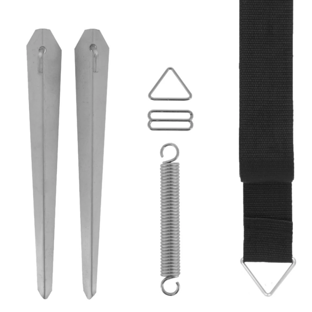 Universal Sturmsicherungs-Kit, bestehend aus extralangem Gurt (13 m x 50 mm), Spiralfeder (15 cm) und zwei Heringen (38 cm). Optimal zur sturmsicheren Verankerung von Markisen und Vorzelten. Passend für Vorzelte.