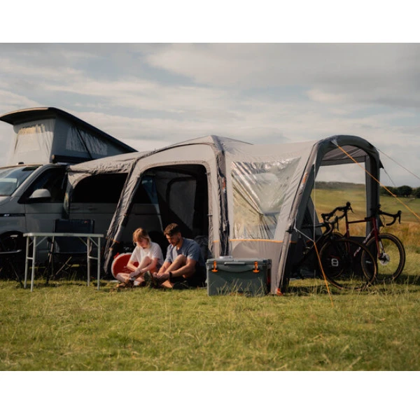 - Aufrollbarer Verbindungstunnel – Nehmen Sie Ihre Markise ab, wenn Sie für den Tag wegfahren, rollen Sie den Tunnel einfach zurück und sichern Sie ihn mit einem Kippschalter