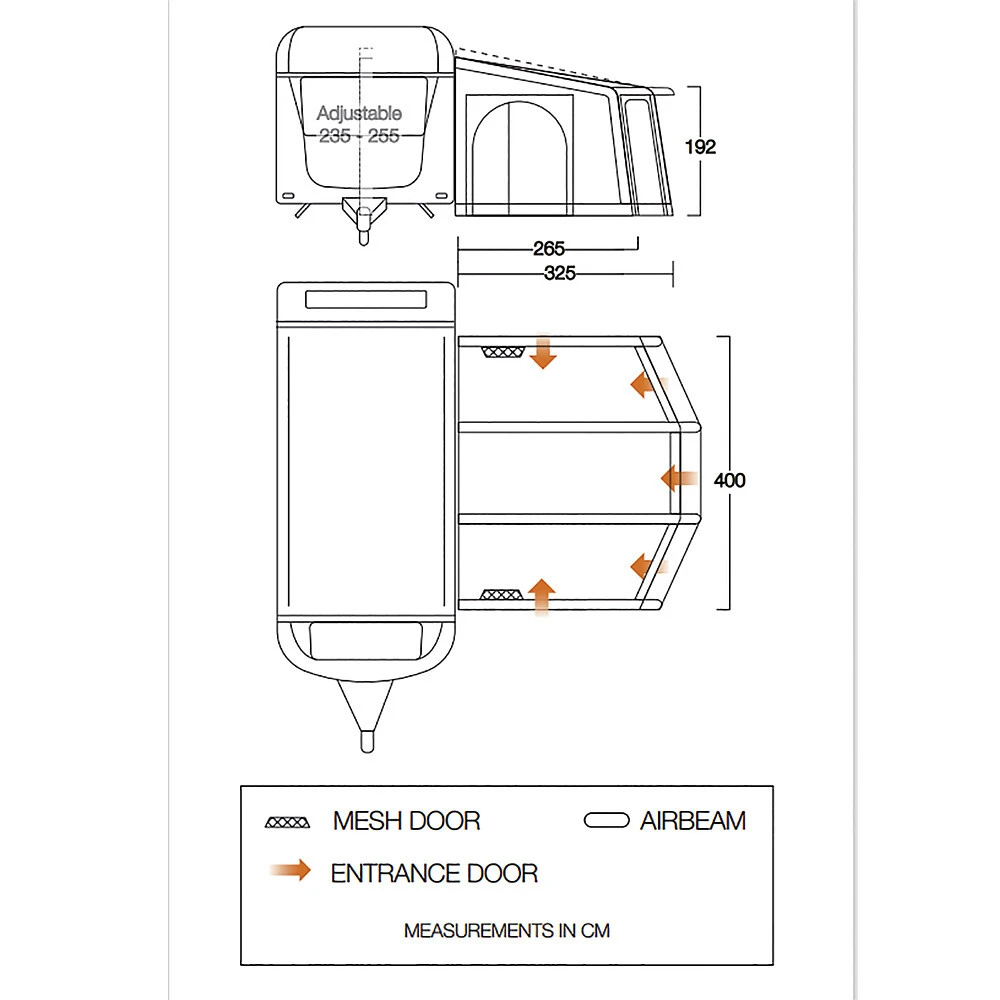 Das aufblasbare Wohnwagenvorzelt Tuscany Air ist mit dem revolutionären S.I.-Pro-System von Vango ausgestattet. Das Vorzelt wird von einem Ventil aus aufgeblasen: mehrere Ventile erleichtern dann den Abbau. Das Tuscany ist mit dem neuen Elements-ProShield-Stoff mit Vango-ColourLok-Technologie ausgestattet, welche die Auswirkungen von UV-Strahlen reduziert. Es ist kein Boden enthalten.