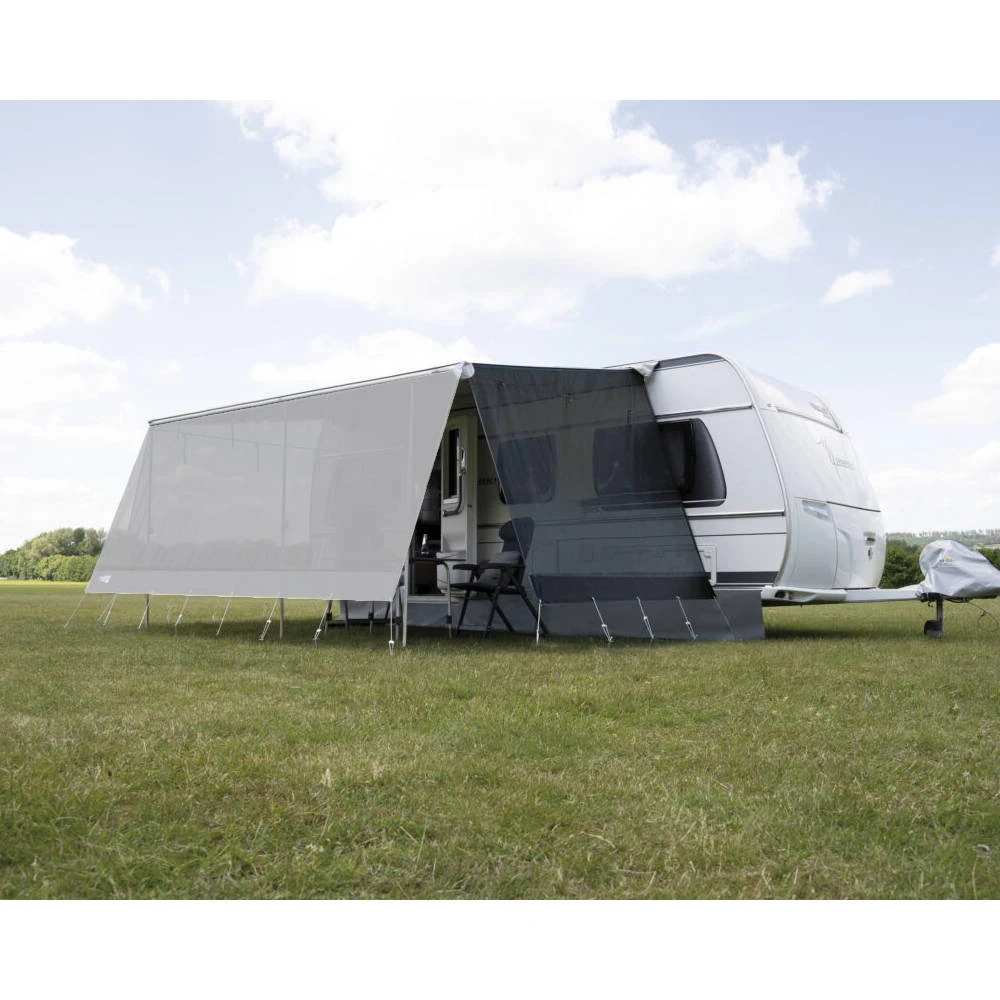 Ganz egal wo Sie stehen: Dieser luftdurchlässige Sunscreen sorgt dafür, dass Sie den Blick in die Landschaft trotzdem ohne Einschränkung genießen und die frische Meeres-, Wald- oder Bergluft einatmen können. Die Seitenwand wird einfach auf die seitliche Dachstange geschoben und mit der Markise verklettet.